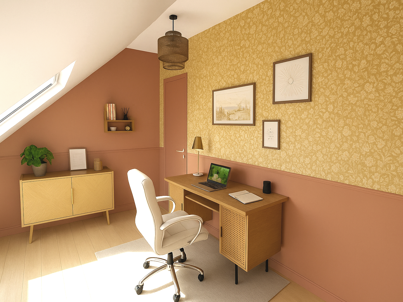 Matériaux et couleurs choisies : blanc cassé, vieux rose, jaune orangé avec des accessoires dorés. Cette palette apporte énergie, motivation et concentration